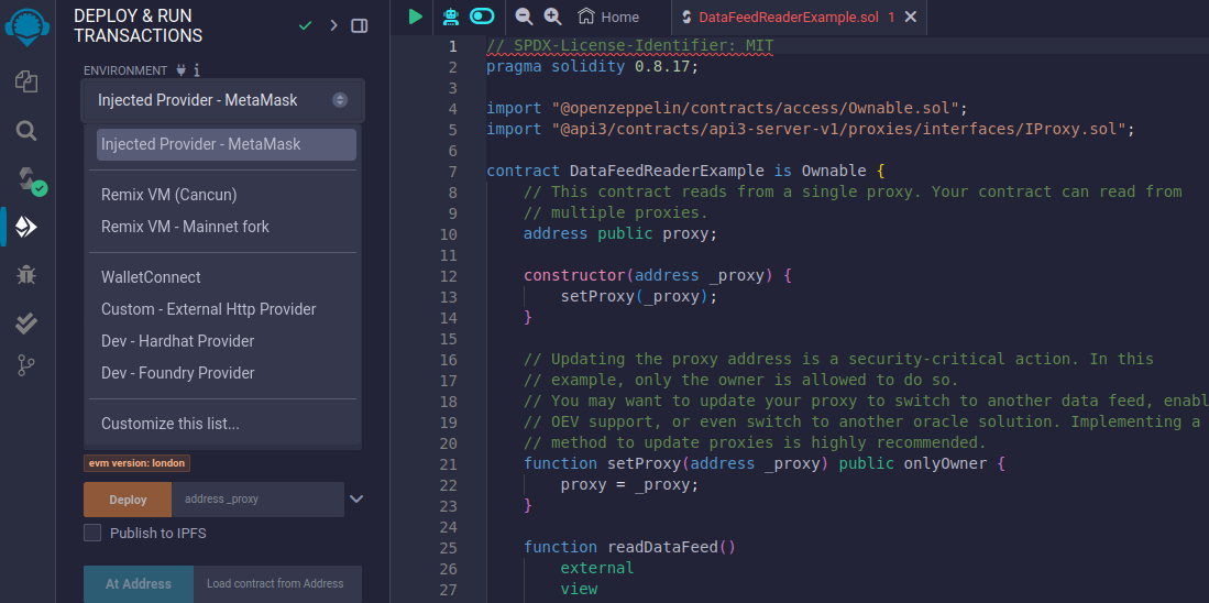 Return to Remix IDE. With the "Deploy & run transactions" tab selected on the left sidebar, paste the Api3ReaderProxyV1 address into the textbox next to the "Deploy" button, then click the button.